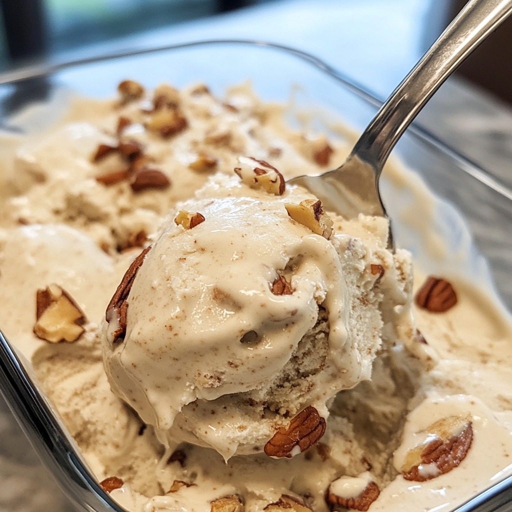 During the last minute of churning, add the toasted pecans into the ice cream. This ensures that the pecans are evenly distributed throughout the mixture for that perfect crunch in every bite.