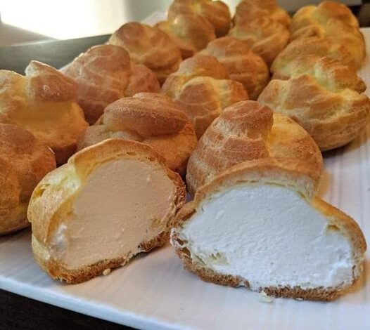 - Pipe a bit of the filling on the bottom of one puff, and place another on top of the cream to form a little sandwich. Repeat this step to create the remaining cream puffs, and serve.
