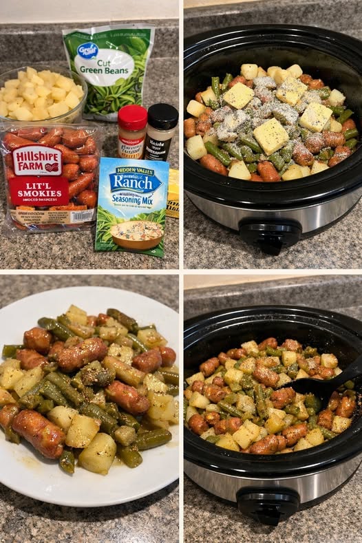 This is the classic Crockpot Green Beans, Potatoes & Smoked Sausage (often called “Ranch Sausage & Potatoes”).