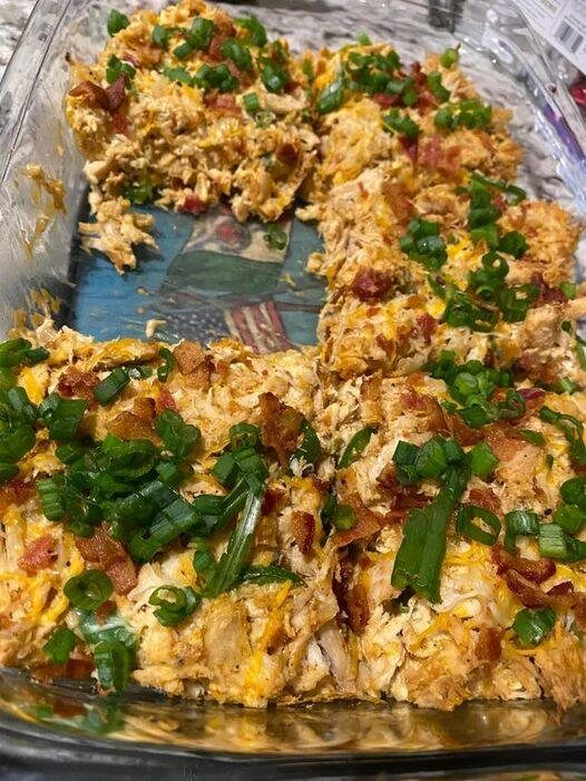 Add this mixture to a greased 9×11 casserole dish and sprinkle the crispy bacon pieces all over the top.