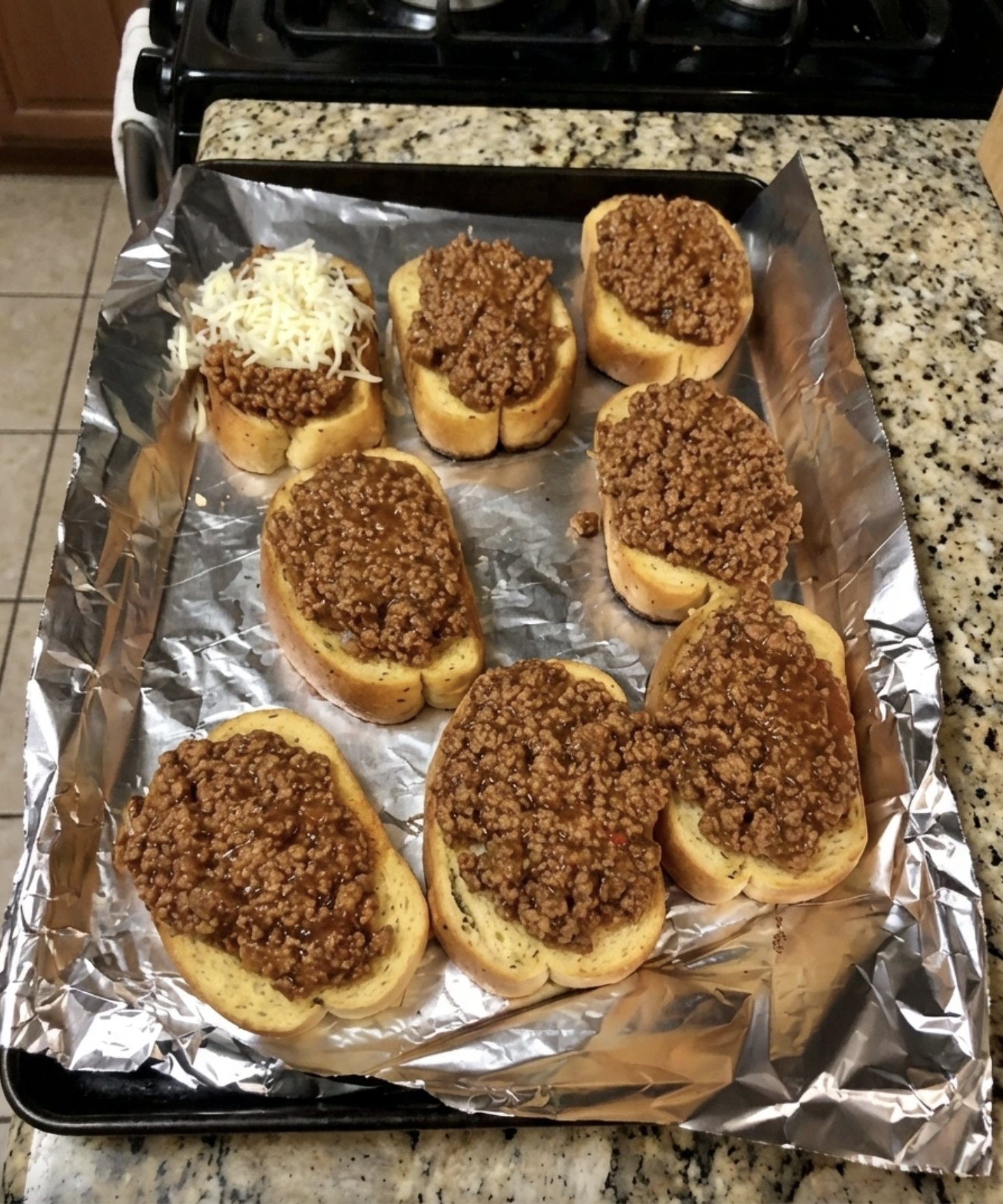 Spoon sloppy joe mixture onto each slice. Top with shredded cheese. -