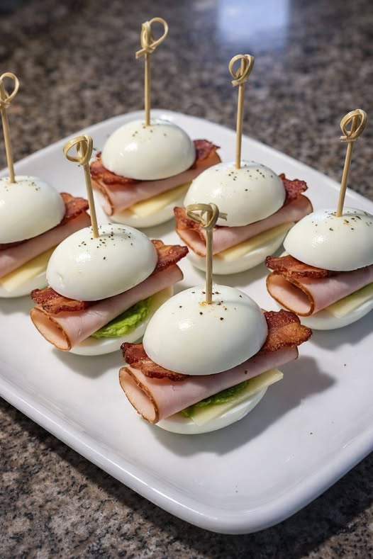 On the bottom half, layer a slice of deli turkey, a piece of crispy bacon, and a small square of Swiss or provolone cheese. Add a tiny dollop of your avocado spread, then top with the other egg half to make a mini slider. Secure with a toothpick.